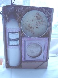 Made with Essential and Botanical Oils. 9 ounce Body Lotion, 8 ounce Candle in Tin, 5.1 ounce Vegetable Soap in a cellophane window gift box.