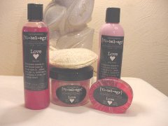 Strawberry Fragrance. This romantic package contains an 8 ounce Bath Gel, 8 ounce Body Lotion, 8 ounce Bath Salts, 4.25 ounce Sparkle Glycerine Soap, and Heart Loofah Sponge. Attractively packaged in a clear vinyl tote.